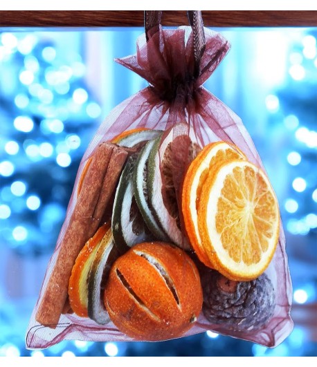 Bring a touch of festive cheer to your home with our Fruit Organza Bags. These delicate bags are filled with dried fruits, cinnamon sticks, and delicately scented .