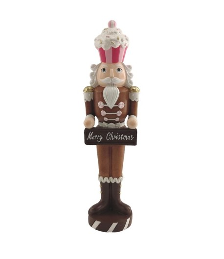 Add a delicious twist to your festive décor with this novelty nutcracker soldier, dressed in warm brown tones and topped with a decorative pink cupcake hat complete with frosting and sprinkles! Holding a charming "Merry Christmas" chocolate-style sign, this sweet-themed figure brings playful personality and a dash of holiday cheer to any display.