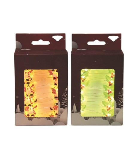 2 assorted boxed lights featuring 20 LED lights. Each set is adorned with either festive holly or reindeer figures. These battery-operated lights are ideal for decorating mantels, shelves, rooms or Christmas trees. Easy to hang and effortlessly charming.