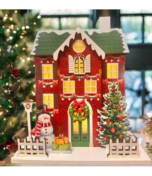 Wooden festive house in white with beautiful detailing and Christmas accents glows with LED lights, adding a magical touch to your seasonal décor.