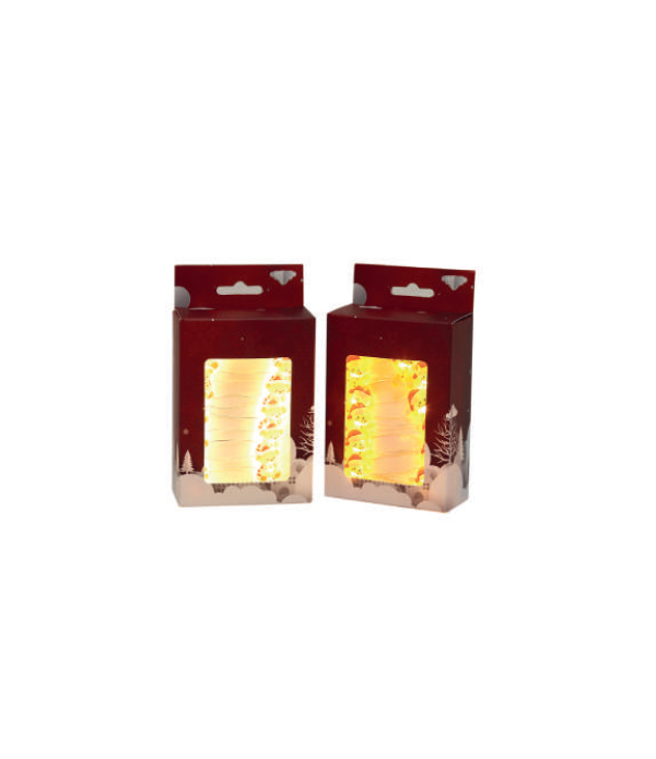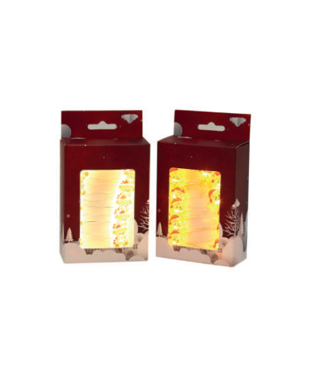 2 assorted boxed lights featuring 20 LED lights. Each set is adorned with either festive teddy or gingerbread figures. These battery-operated lights are ideal for decorating mantels, shelves, rooms or Christmas trees. Easy to hang and effortlessly charming.