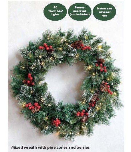 Prelit Pine Cones & Berries Christmas Wreath 60cm
