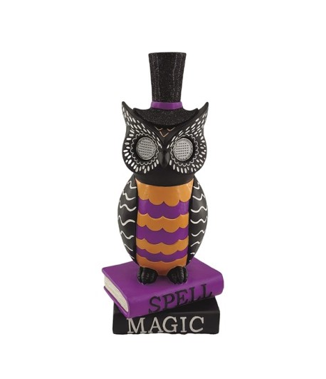 This novelty owl decoration is full of character and charm. Perched smartly on a stack of vintage-style books, this wise little owl dons a classic black top hat and features delightful moving eyes that add an animated touch of fun to any Halloween display.