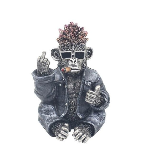 Sitting down in his leather jacket, sunglasses on and smoking a rather large cigar, this tough guy gorilla raises its middle finger and flips the bird in a cheeky gesture that is sure to make you grin.