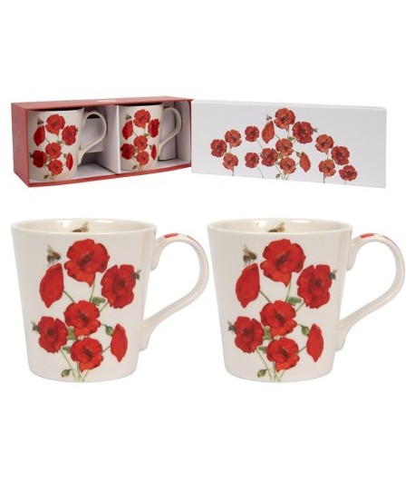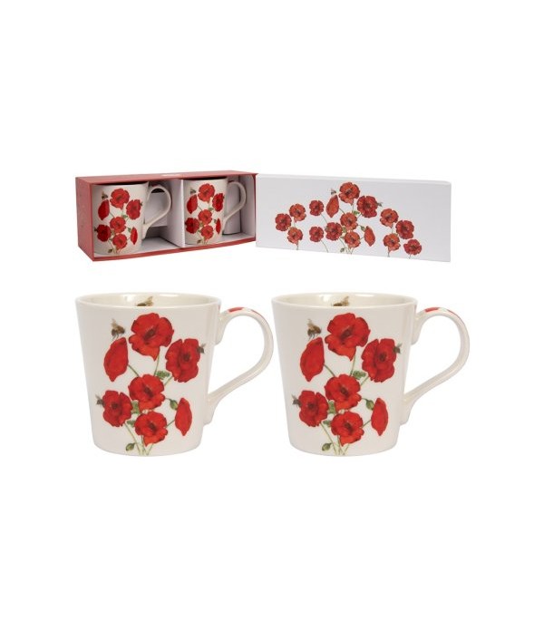 A set of 2 mugs from the Bee-tanical range, adorned with deep red Poppies and bees.