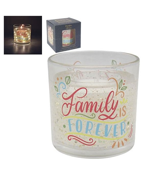 Design: Housed in a clear glass tumbler, the candle is filled with a sparkling gel that contains gold glitter and colorful, celebratory text. The vibrant text reads "Family is Forever" in a delightful script.