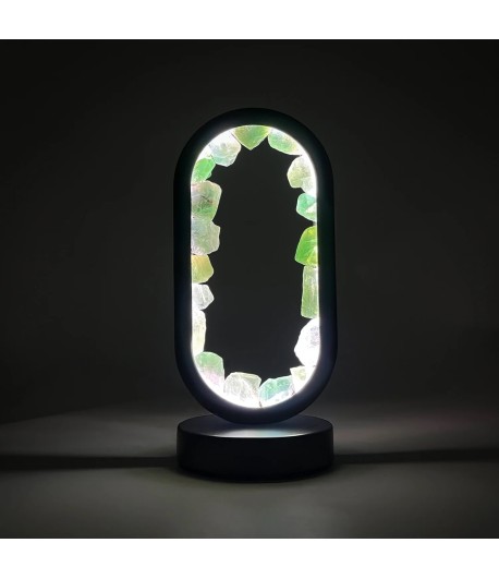 Crafted with naturally vibrant green fluorite and encased in a sleek oval glass vessel, this refined lamp casts a soft, ambient glow that enhances any room with a calming, restorative presence. Ideal for shelves, bedside tables, or serene interior displays, it offers a harmonious blend of natural energy and contemporary style.