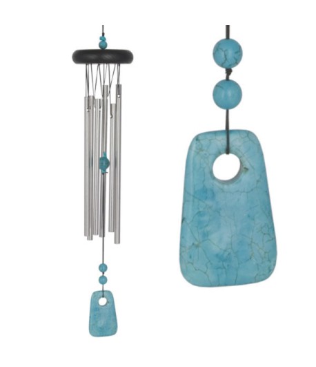 Black finish ash wood and 6 silver polished aluminium rods with genuine stone and bead accents. Turquoise represents the Throat Chakra, which is related to sound and self-expression.