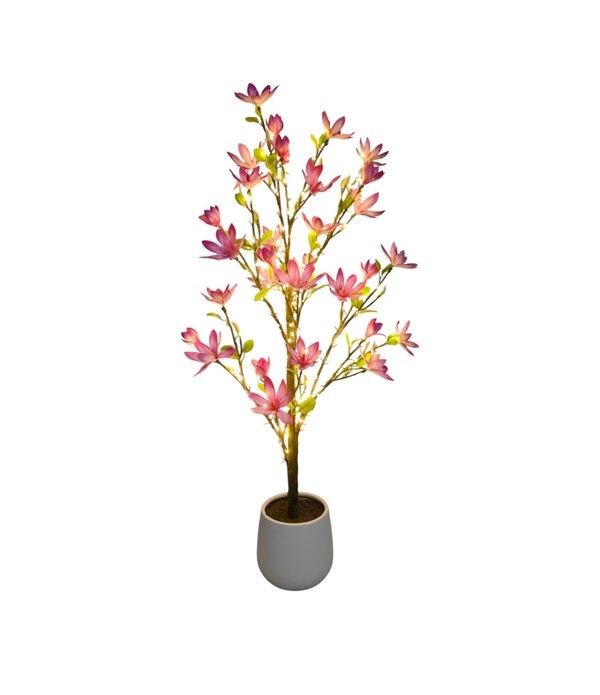Delicate pink magnolia blossoms on flexible branches adorned with 180 LED lights sat in a white pot with a natural looking faux soil. This illuminated tree brings a soft, natural glow to any room and combines nature inspired beauty with modern lighting.
