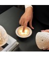 Candle holder featuring a whimsical scene of a snow-covered village wedged between fields and valleys sitting quietly under the glowing snowflakes in a cut-out design.