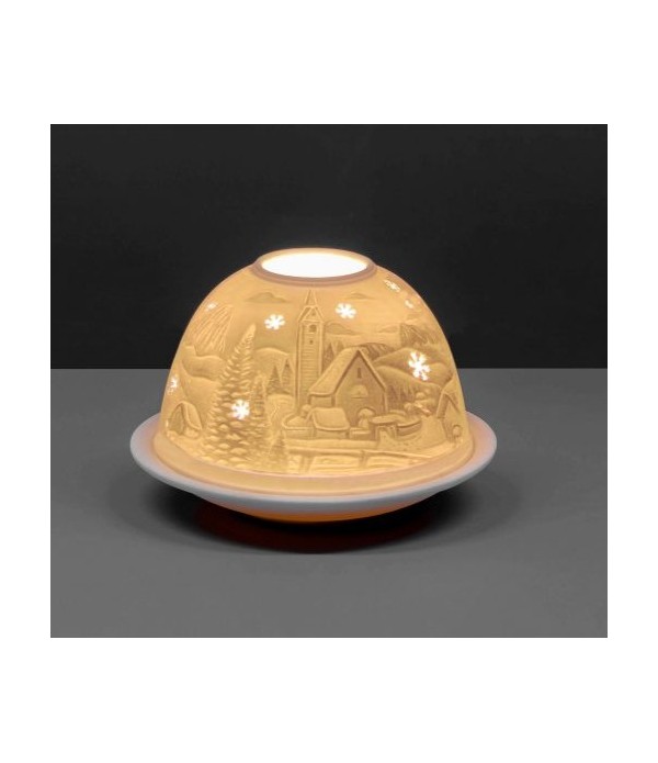 Candle holder featuring a whimsical scene of a snow-covered village wedged between fields and valleys sitting quietly under the glowing snowflakes in a cut-out design.