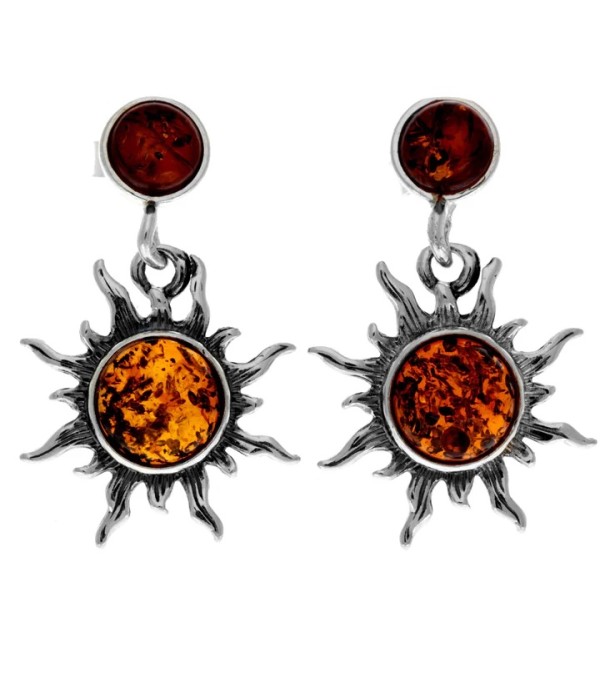 925 Sterling Silver & Genuine Baltic Amber Sun / Star Drop Earrings