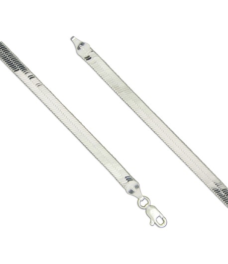 46m/18in medium herringbone. A classic and elegant jewellery piece known for its unique, flat, and fluid design. The herringbone pattern is created by closely interlocking V-shaped links that lie flat, giving the necklace a smooth and sleek appearance that is highly light reflective. It has a lobster clasp for secure wear.