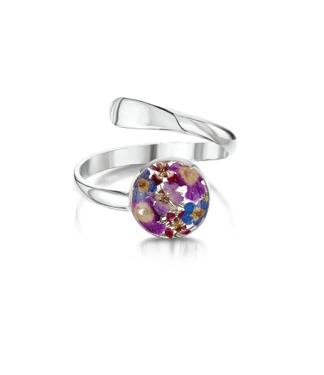 Sterling silver adjustable ring with real flowers in resin. Handmade with verbenas and forget-me-nots. Comes in a luxury gift box with a care booklet.