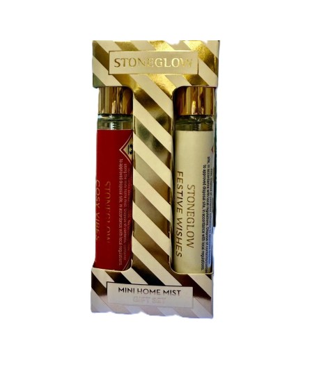 Stoneglow Mini Home mist Gift Set - 1x15ml Festive Wishes, 1x15ml Cosy Vibes. A heartwarming combination of zesty orange, spicy cinnamon, nutmeg and clove. A warm, woody base of patchouli, vanilla and musk will ensure that this delightful fragrance warms the cockles of your heart.